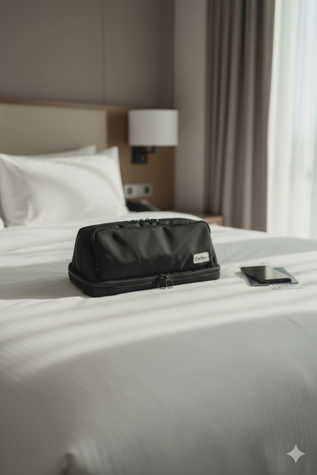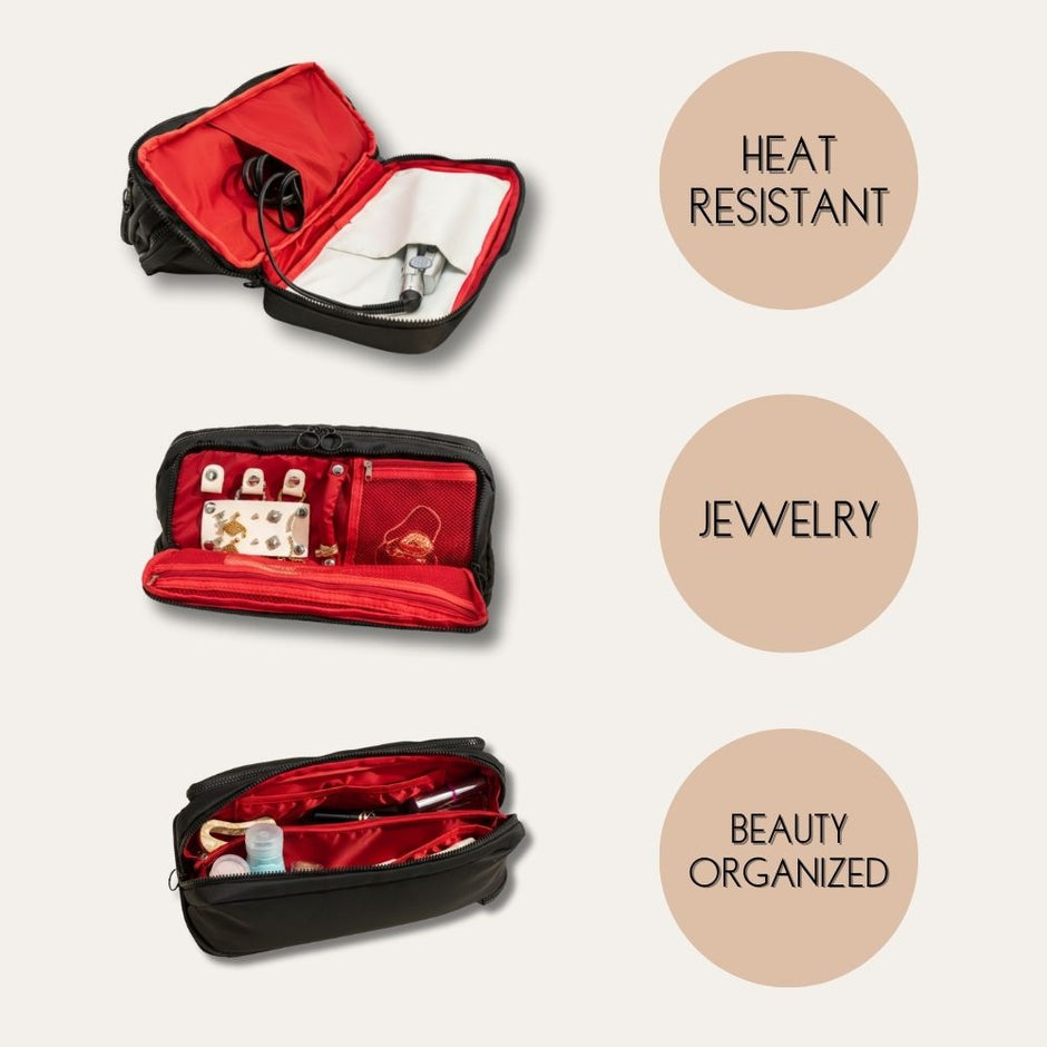 Unlike juggling multiple pouches, this all-in-one bag keeps your essentials, hot tools, jewelry, makeup, and toiletries in one organized place, saving space and time when packing or unpacking.